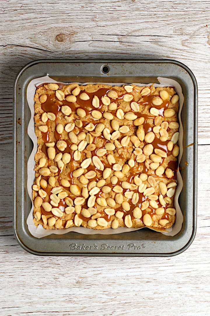 - Sprinkle 1/2 cup of the peanuts evenly over the chocolate and caramel.