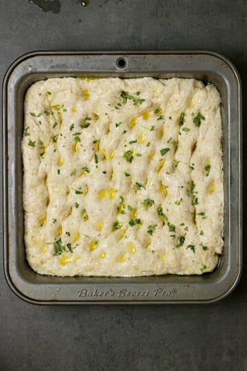 Remove pan cover and drizzle the top of the dough with an additional 1 Tablespoon of olive oil. Using oil-coated fingertips, gently press your fingers into the dough, all over the top of the dough to create dimples. If desired, sprinkle the top of the dough with chopped rosemary, up to 1/4 teaspoon kosher salt, or another topping.