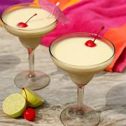 Add 3/4 cup canned coconut milk, 1 cup frozen pineapple, 2 Tablespoons simple syrup (or 1 Tablespoon of granulated or super-fine sugar), 1 ounce white rum, 1 ounce coconut rum, and one handful of ice cubes to a blender. Blend until smooth. Pour into two glasses and serve with a slice of lime or maraschino cherry as desired.