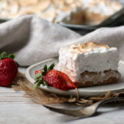 Dollop the meringue over the strawberry rhubarb curd layer, and very carefully spread the meringue to the edges of the baking pan, being careful not to mix the meringue with the curd. If desired, you can toast the top of the meringue with a kitchen torch or under the broiler (do NOT take your eyes off of it, it will brown VERY quickly).
